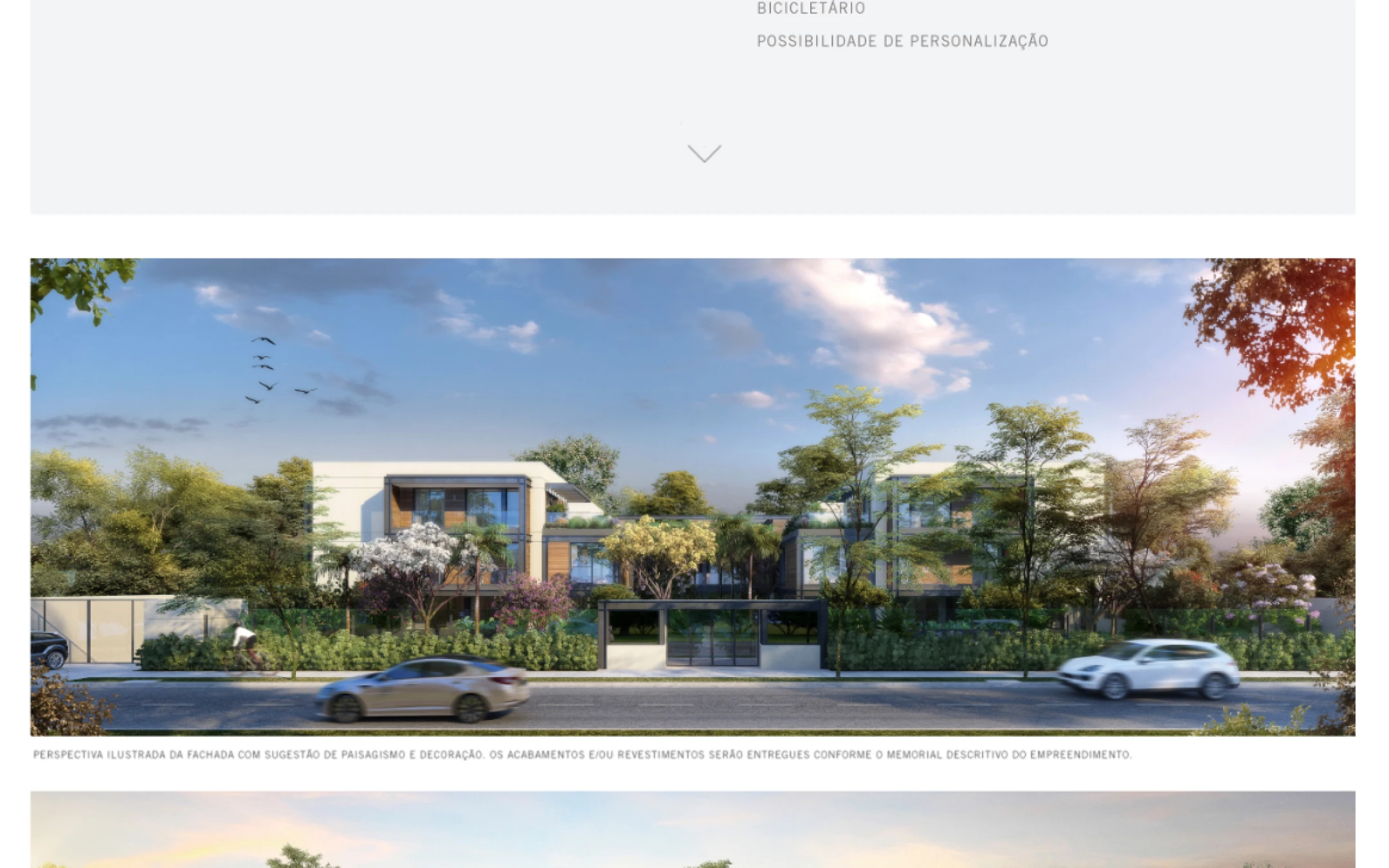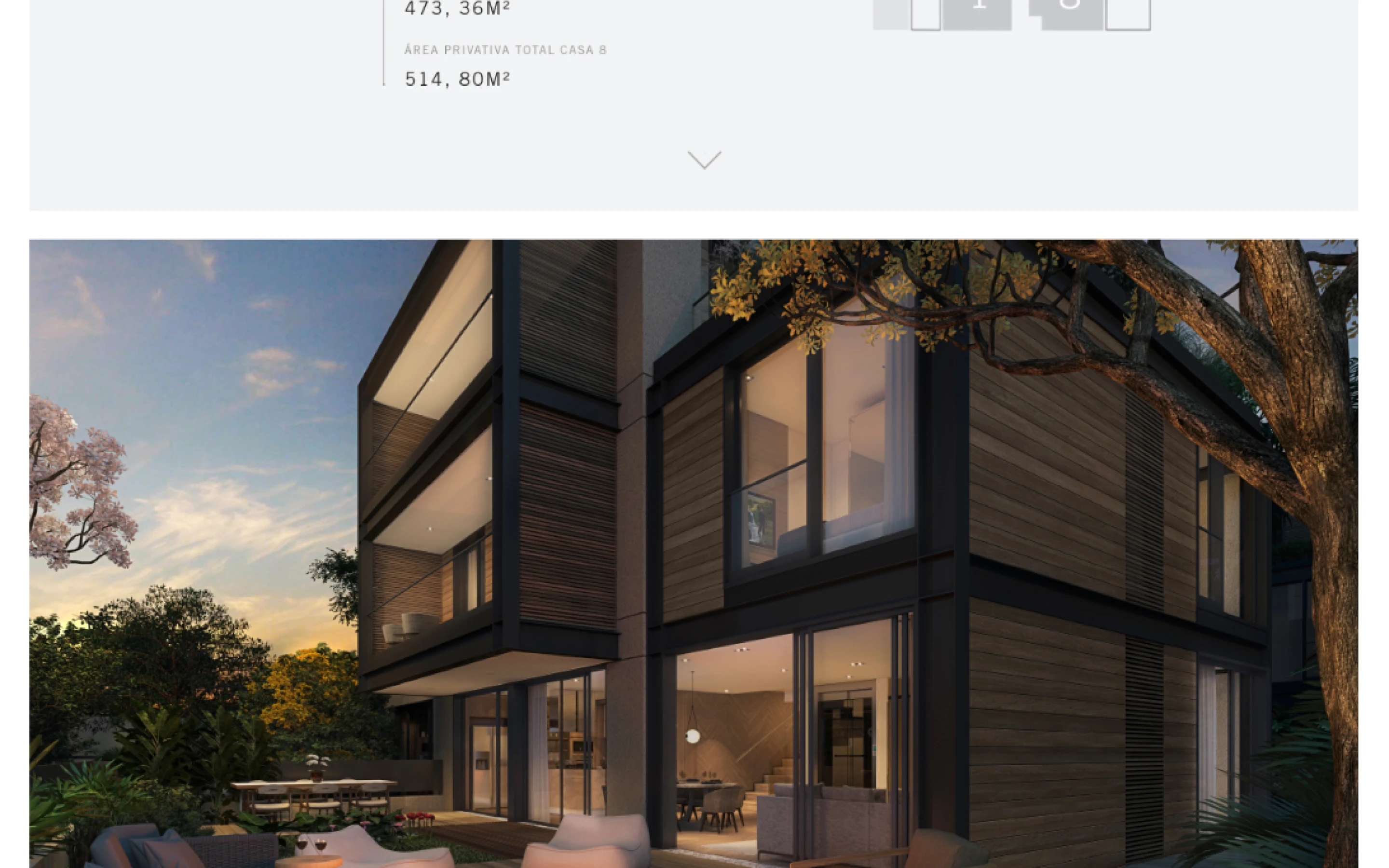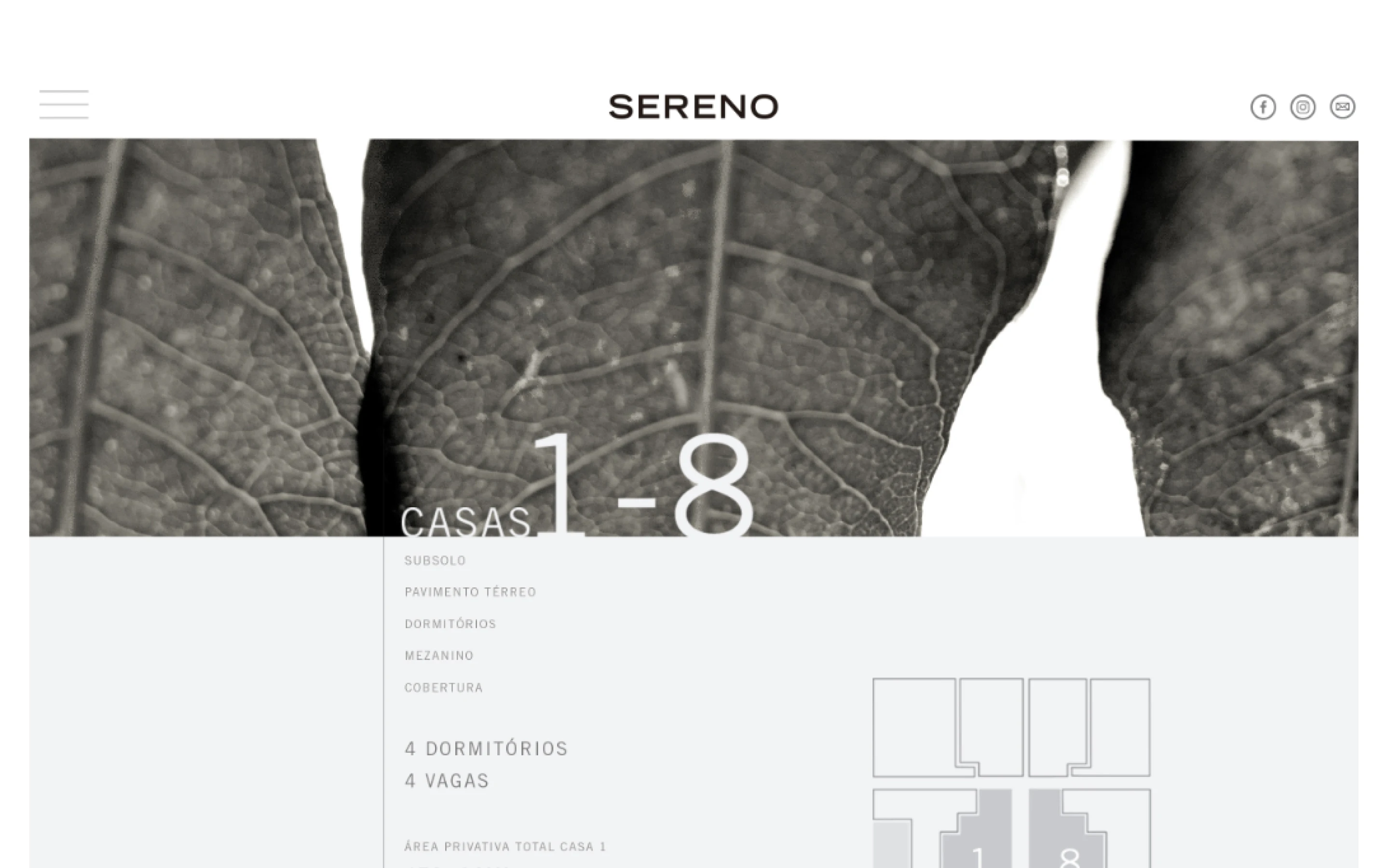 A seção das casas era onde a qualidade das renders de arquitetura precisava brilhar. O desafio era deixar as imagens ocuparem o máximo de espaço possível sem transformar o site num slideshow genérico. Optei por uma estrutura que intercalava fichas técnicas minimalistas com renders em full-bleed — o número da casa em destaque tipográfico grande, as informações em colunas discretas, e as imagens tomando conta.