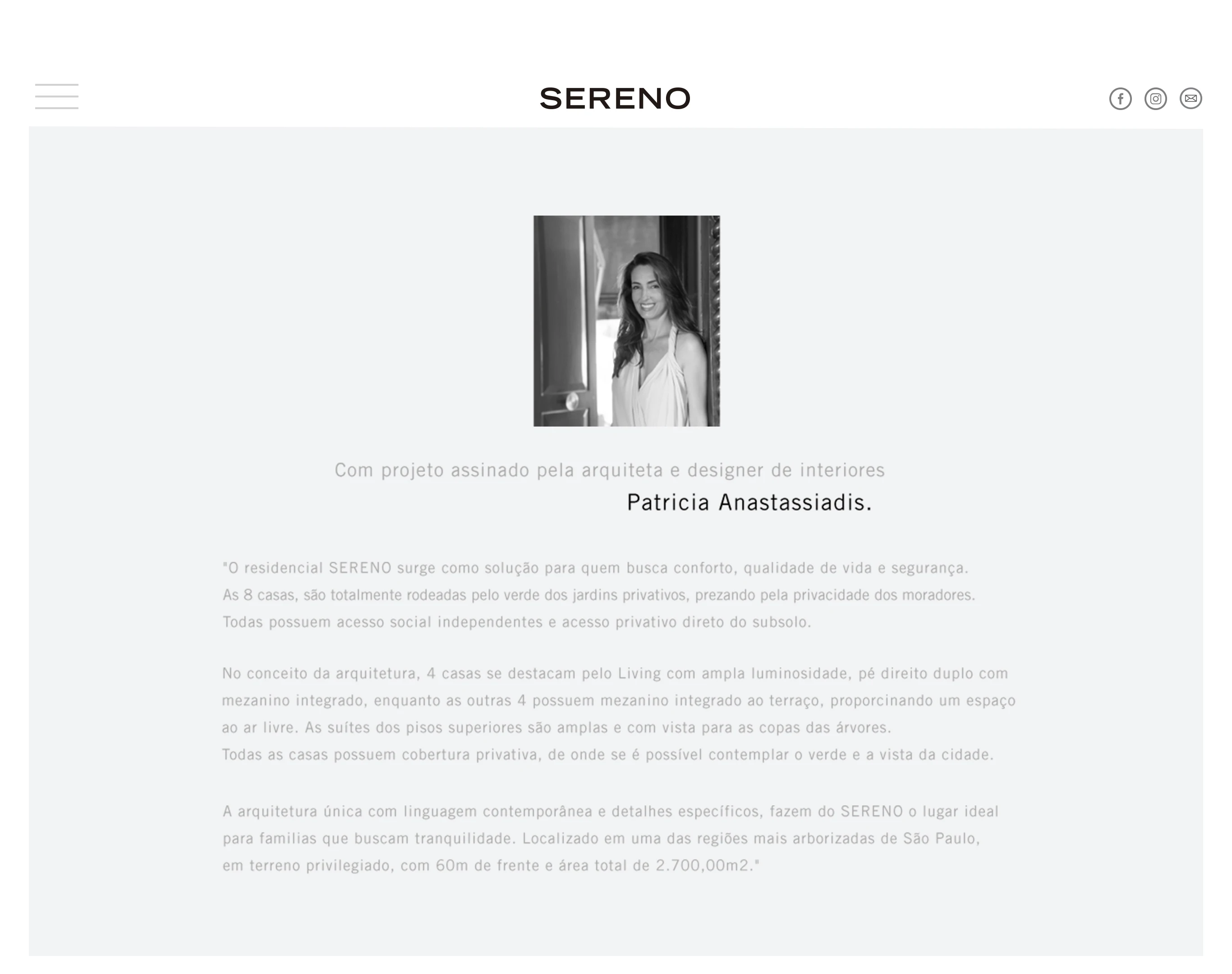 O produto vendia por si só — arquitectura impecável, localização privilegiada, nome de peso na assinatura. O que o SERENO precisava era de uma presença digital e de materiais gráficos que estivessem à altura. Que não parecessem mais um lançamento imobiliário com aquele visual genérico de "sofás bege e fonte serif". Tinha que ser refinado. Tinha que ser diferente. Tinha que combinar com Patricia Anastassiadis.