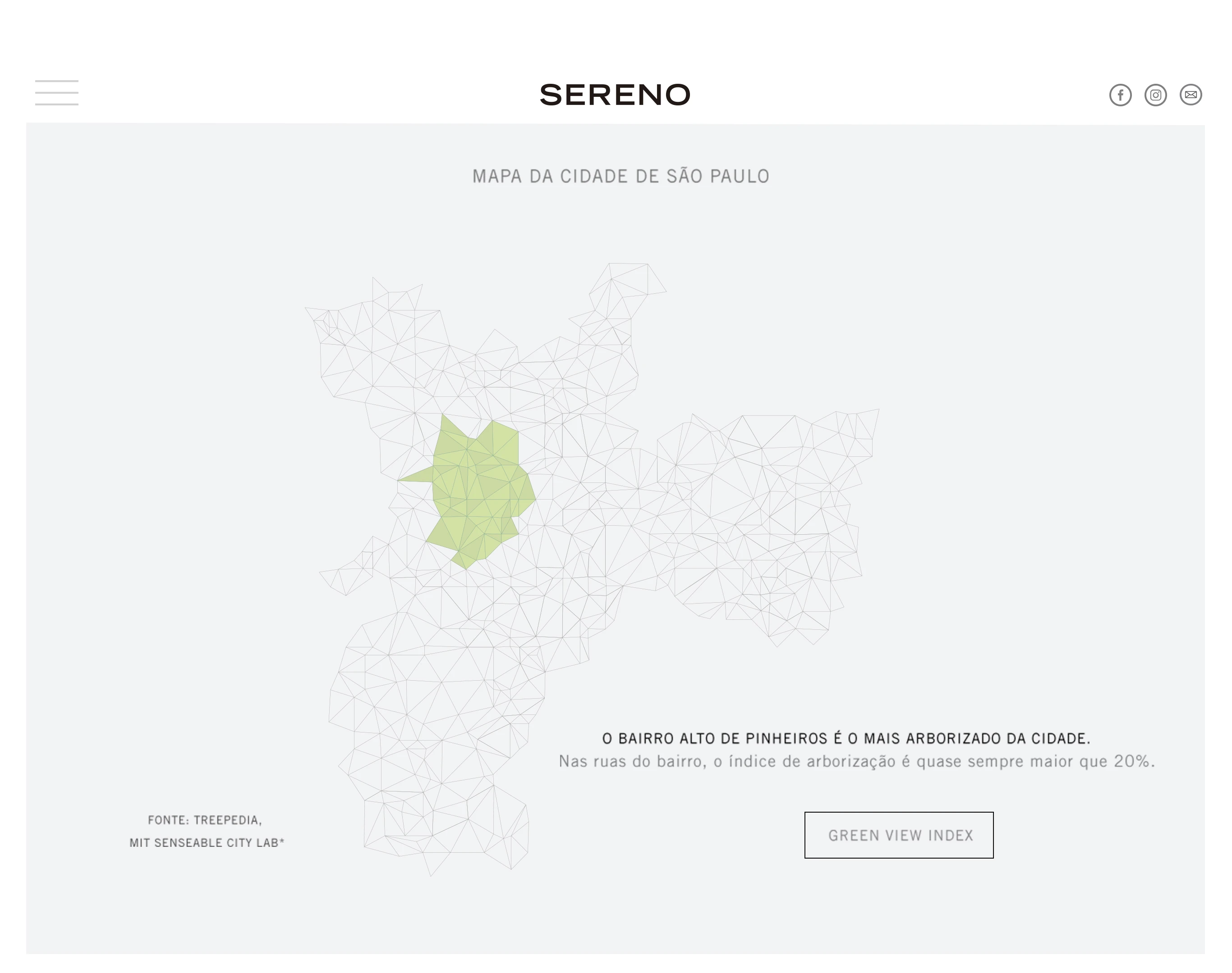 The site didn't have a conventional product page. Each section was a layer of the story: first the neighborhood (the MIT map highlighting Alto de Pinheiros as the city's most tree-lined district), then the development, then the homes, then the architect, then the developers, then contact.