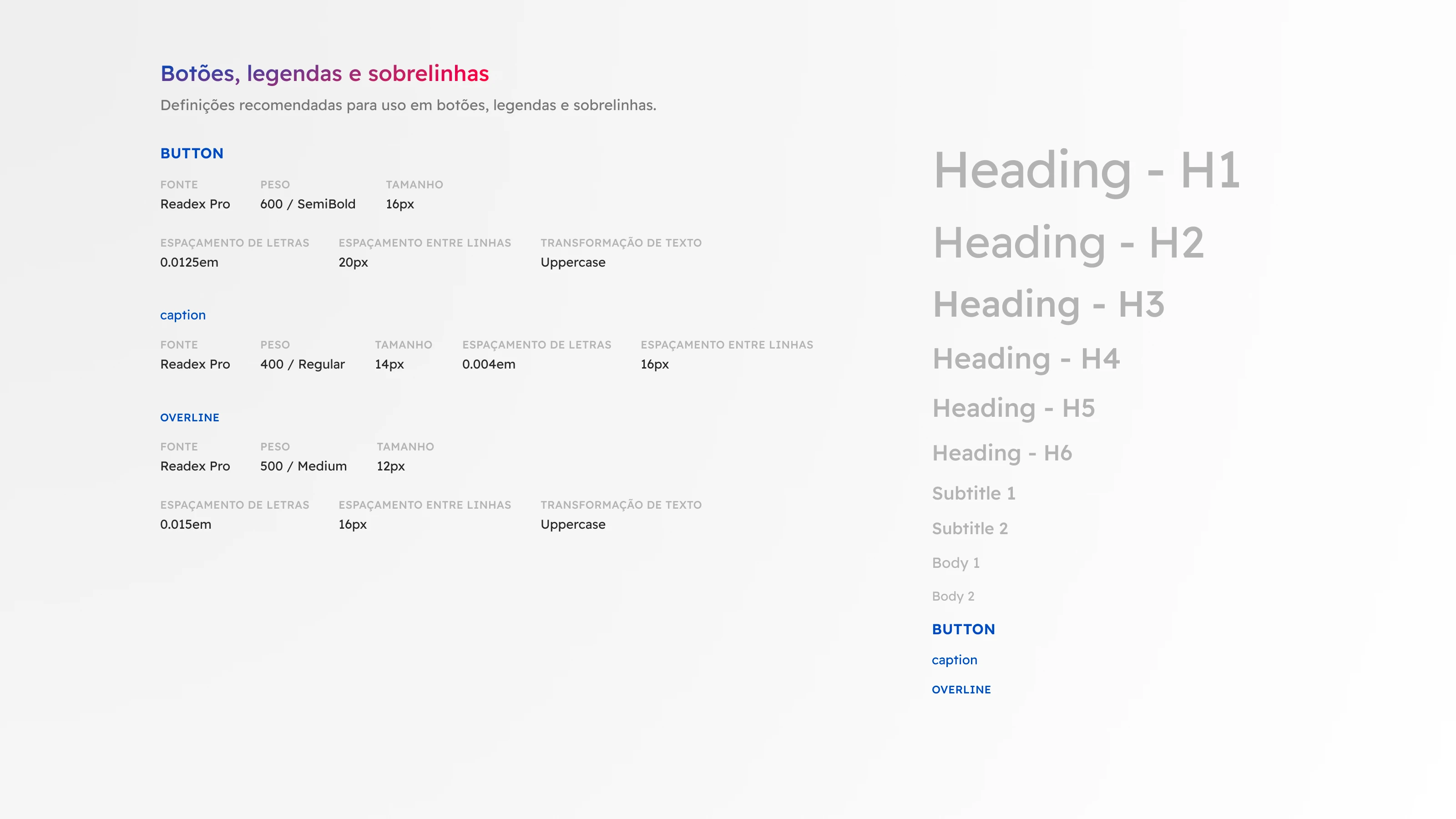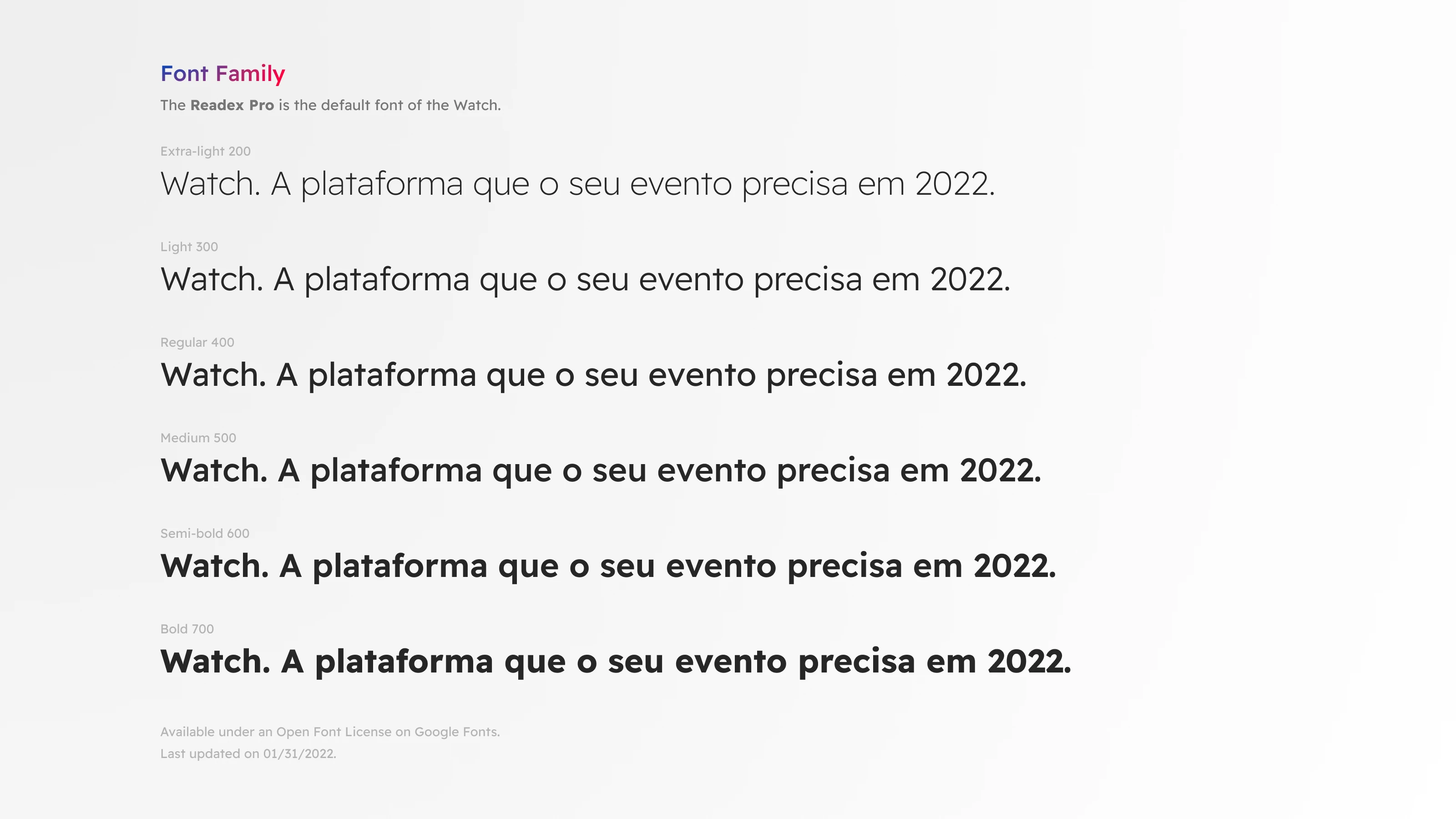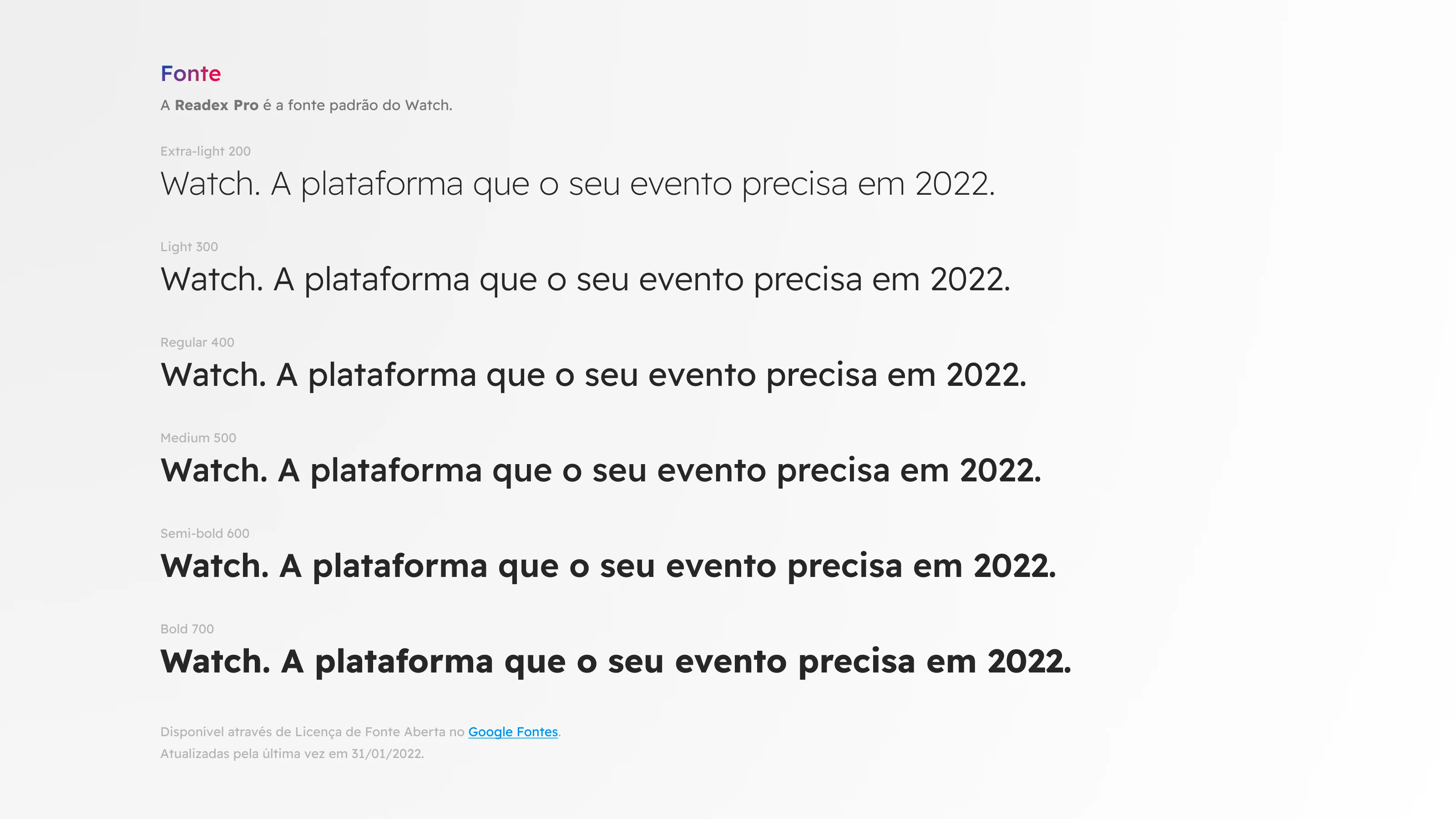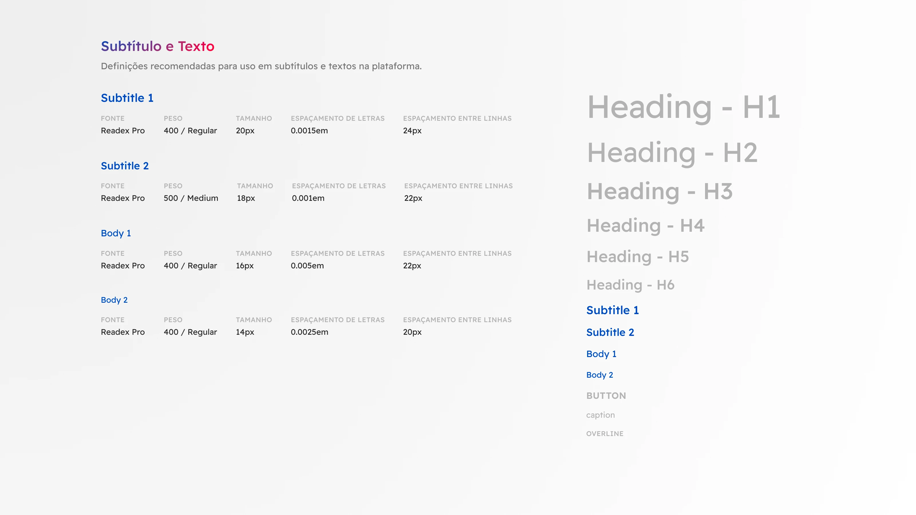 Para tipografia, escolhi a Readex Pro — uma fonte com amplo suporte a idiomas (incluindo árabe e hebraico), o que fazia sentido para uma plataforma que poderia crescer internacionalmente, mas principalmente porque ela funciona muito bem em diferentes pesos e tamanhos dentro de uma interface digital. É legível em corpo pequeno e tem presença em títulos grandes. Uma fonte, vários contextos.