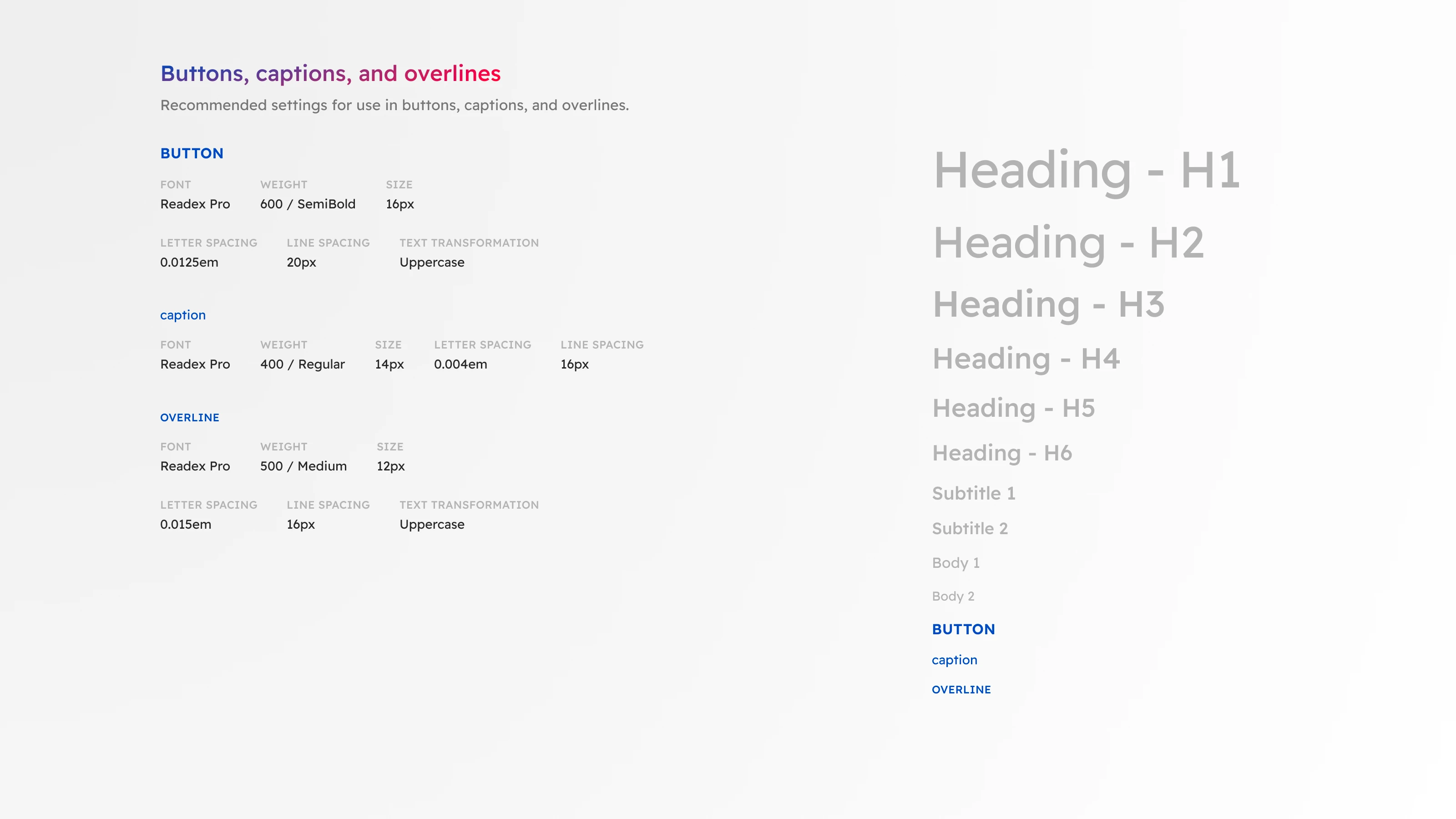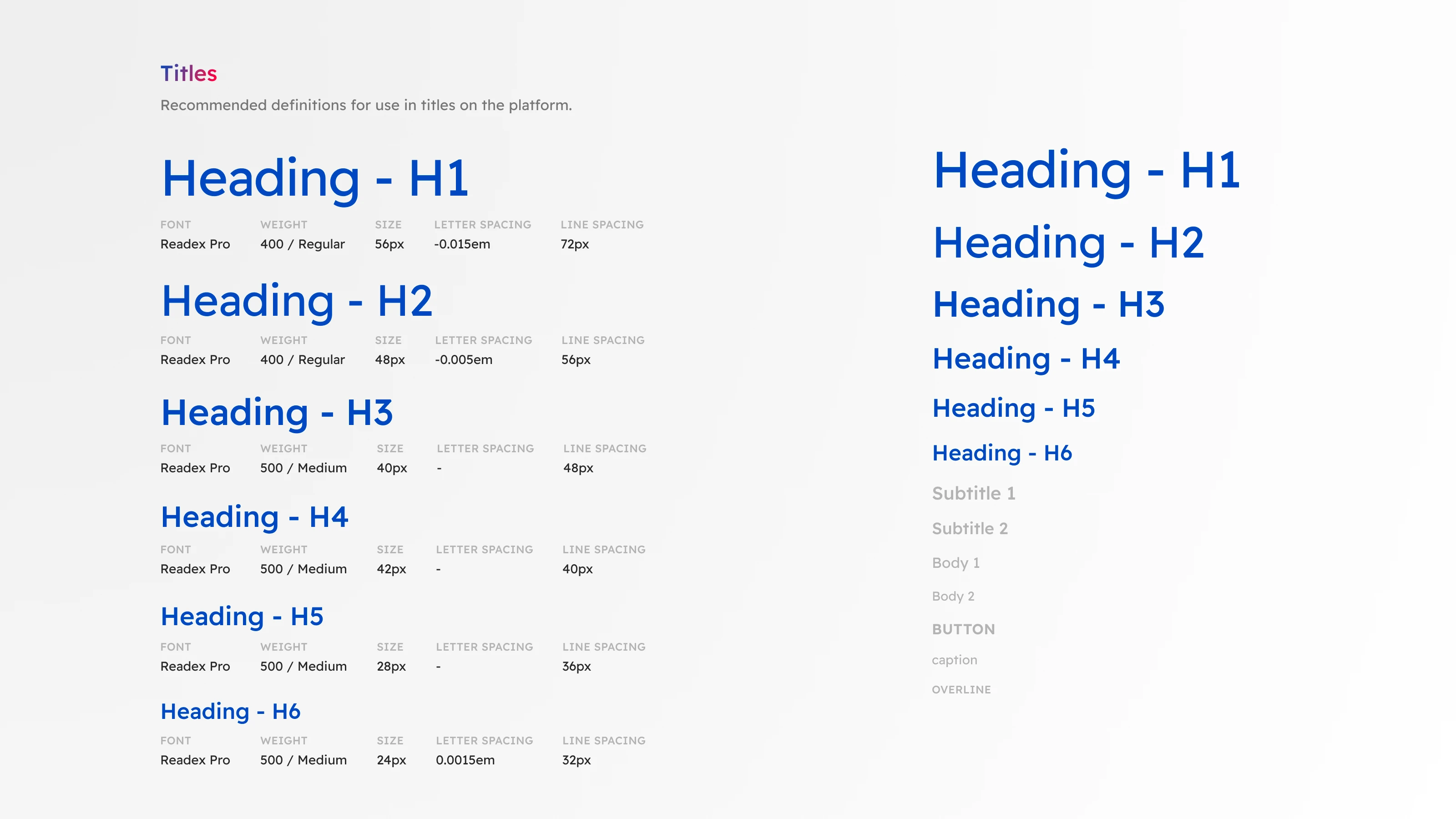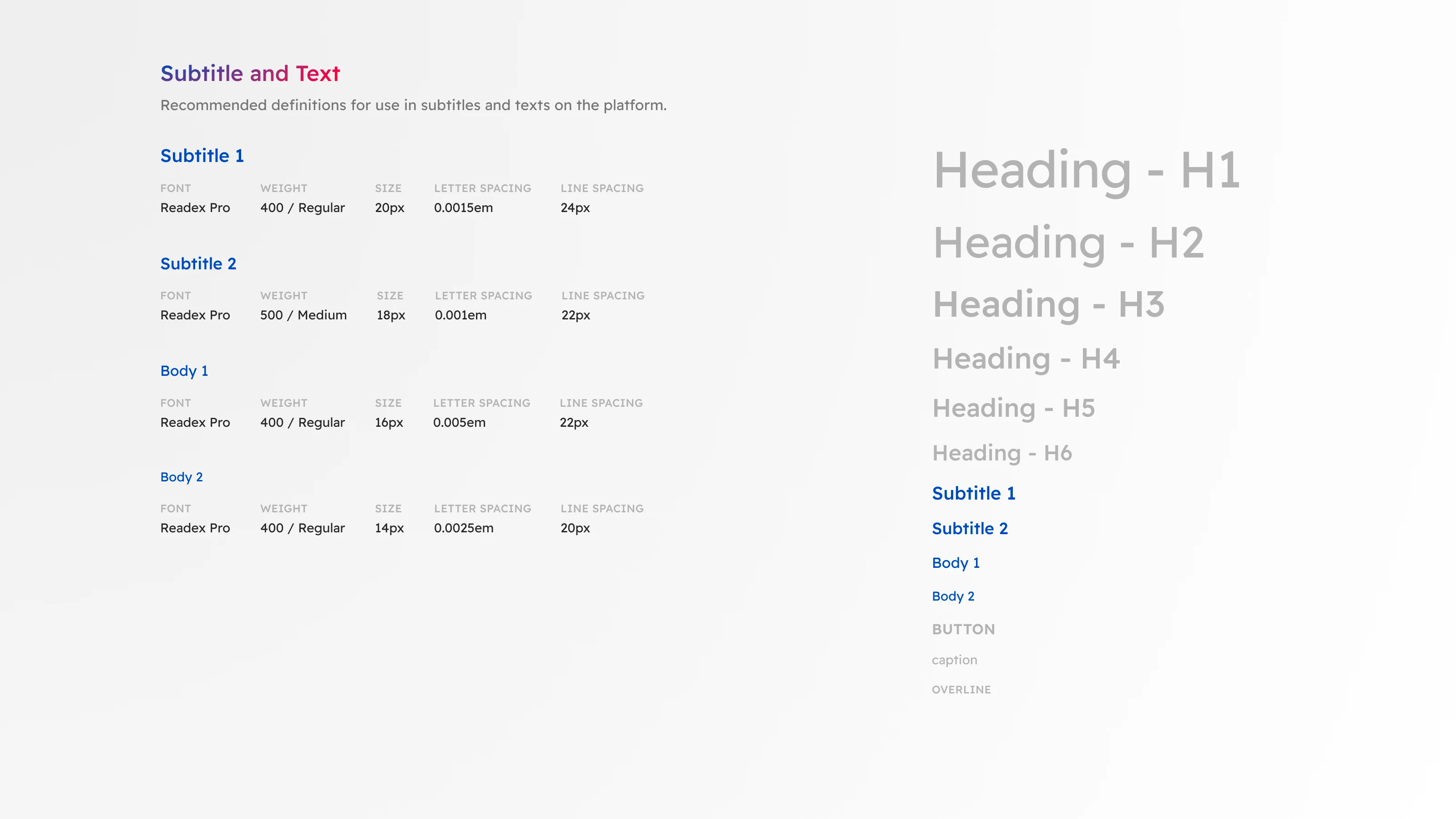 For typography, I chose Readex Pro — a font with broad language support (including Arabic and Hebrew), which made sense for a platform with potential international growth, but mainly because it works well across different weights and sizes in a digital interface. It's legible at small body sizes and has presence at large heading sizes. One font, many contexts.